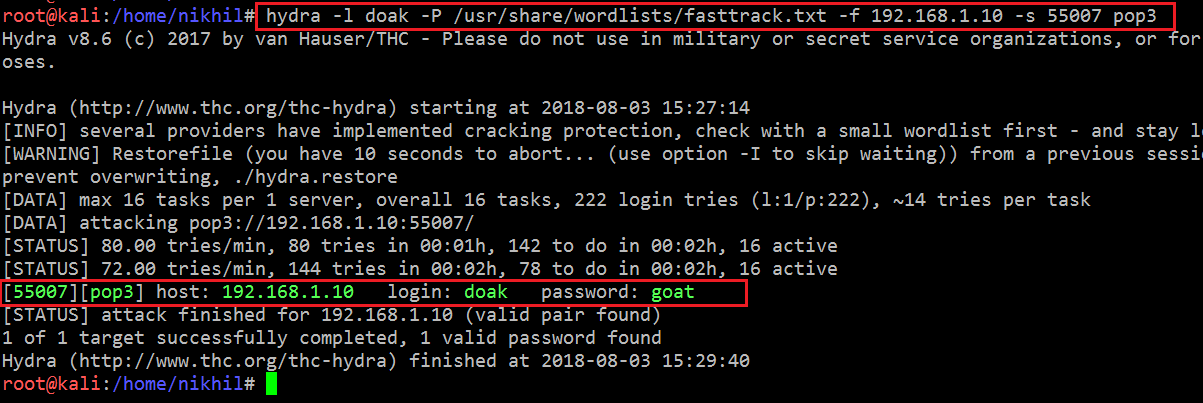 You can see that the tool has successfully cracked the password for the user “doak,” which is “goat.” Let’s try to log in with these credentials on the POP port.