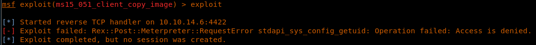 32. We run the exploit and it failed as well, since the current Meterpreter shell from SESSION 1 does not even have the permissions to perform getuid.