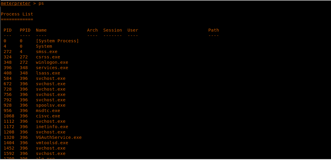 35. Let’s try to migrate the current Meterpreter process to a process under “network service.” In this case, we choose 1804.