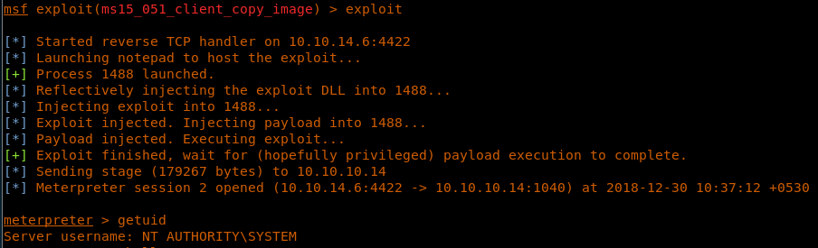 29. Since we now need to escalate the privileges, let’s background this process and use exploit/windows/local/ms15_051_client_copy_image.