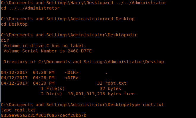 41. Browsing the “Documents and Settings/Administrator/Desktop” to grab the root.txt file.