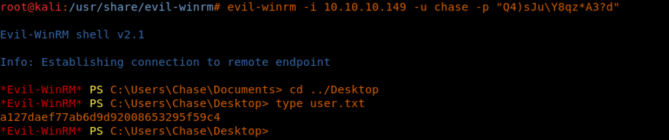 <<evil-winrm -i 10.10.10.149 -u chase -p <pwd>>>
