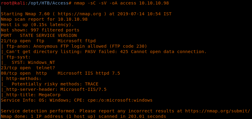 <<nmap -sC -sV -oA Access 10.10.10.98>>