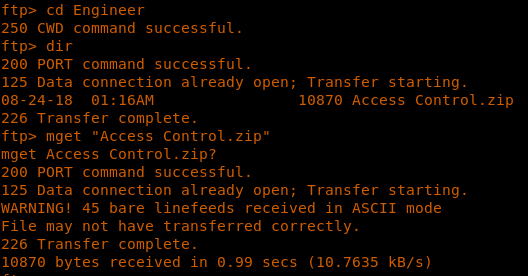 10. Let’s go back the contents we have from FTP and analyzing them. In the Engineer folder, there is a ZIP file which needs a password.
