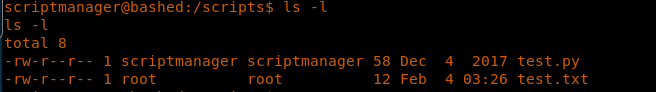 27. Enumerating this directory gives us a Python script and txt file. test.py is owned by scriptmanager and test.txt is owned by root.