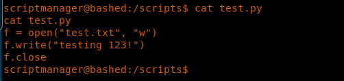 28. Looking into the contents of test.py reveals that the script indeed is writing to test.txt, which is owned by root.