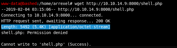 14. Since we have a Web shell, we can try to get this reverse shell via wget. But it looks like we don’t have the permission to create a new file.