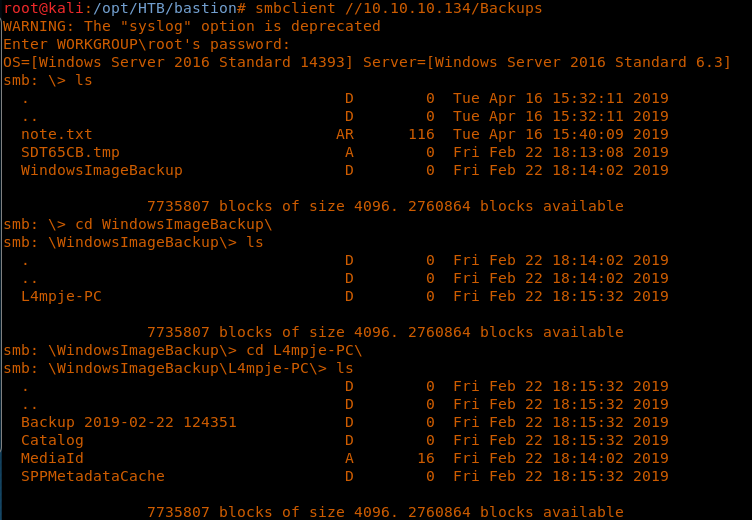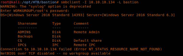 <<smbclient -I 10.10.10.134 -L Bastion>>
