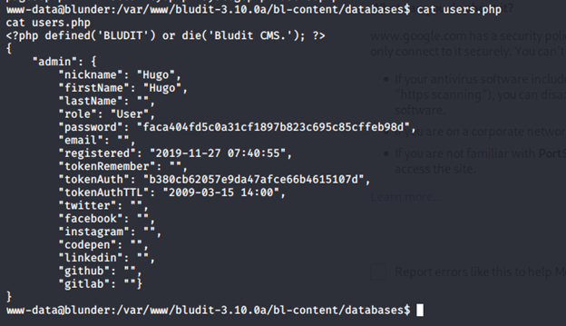 - Checking the database content under this installation, we got hash for user “hugo”. Interesting. And guess what hash was also cracked?