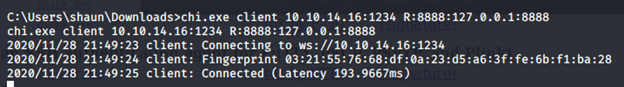 - Upload the chisel Windows utility on the victim machine and run it in client mode to tunnel the ports.