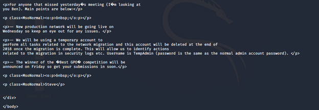 - Meeting Notes 2018.yaml: A meeting notes file was recovered, which mentioned a username (TempAdmin) and hints that the password for this account is same as that of Admin.