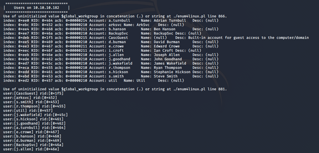 - We’ll run enum4linux on the machine to enumerate more information about it. It reveals following usernames and groups.