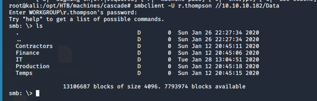 - After multiple tries with the recovered username, the decoded password worked for r.thompson. We can now log in via the decoded password and see the shares from the machine. Out of the default ones, data share stands out.