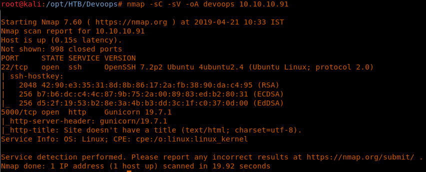 <<nmap -sC -sV -oA DevOops 10.10.10.91>>