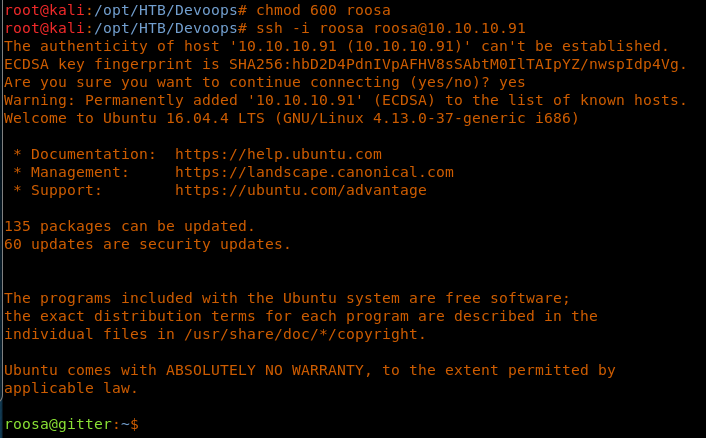 14. We’ll save this key locally on the box and give permissions to it as 600. Using the key to SSH, we are successfully in.