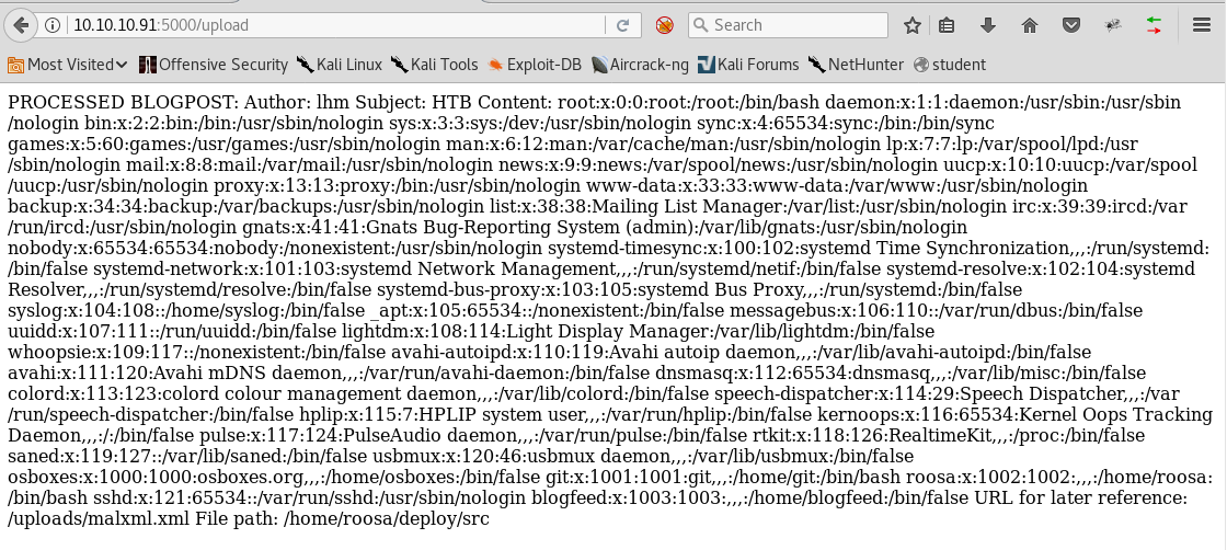 10. Uploading this file via the upload page results in a capture of /etc/passwd. Awesome.