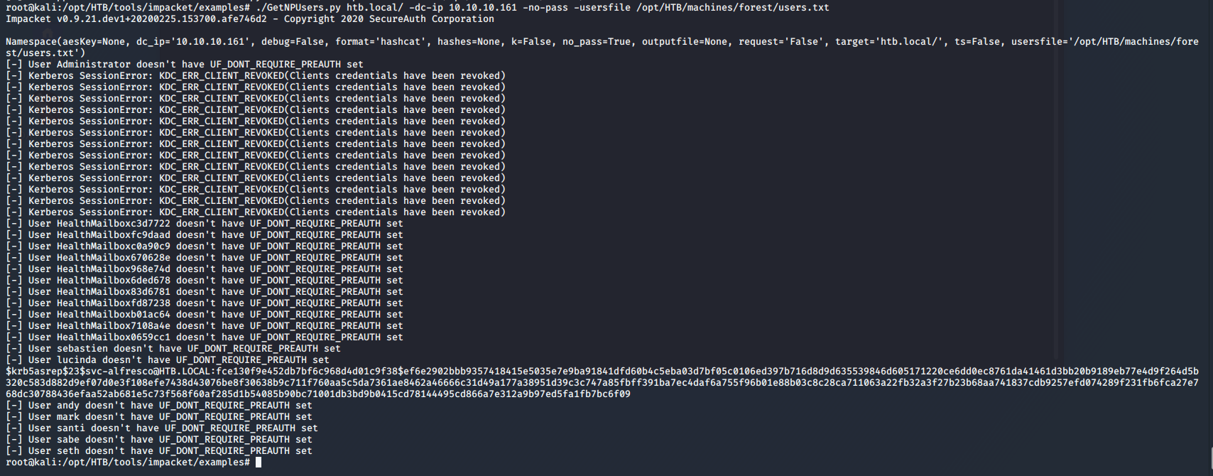 <<GetNPUsers htb.lcoal/ -dc-ip 10.10.10.161 -no-pass>>