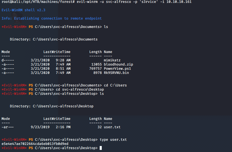 <<evil-winrm -u svc-alfresco -p -i 10.10.10.161>>