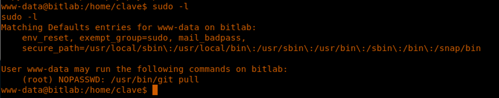- Let’s start elevating the creds. We are running sudo -l lists that we can run the git pull as root.