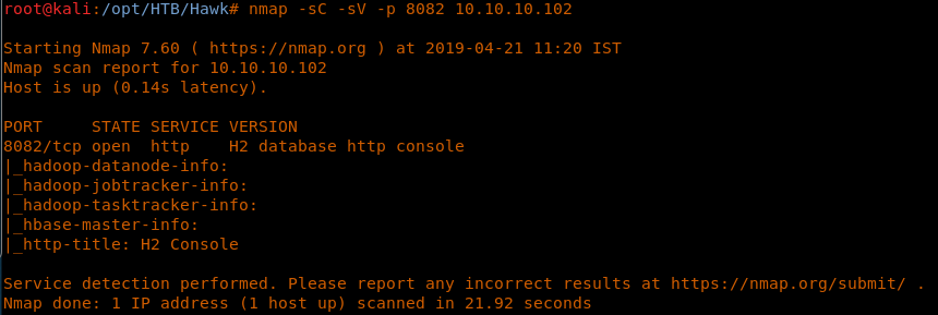 <<nmap -sC -sV -oA Hawk 10.10.10.102>>