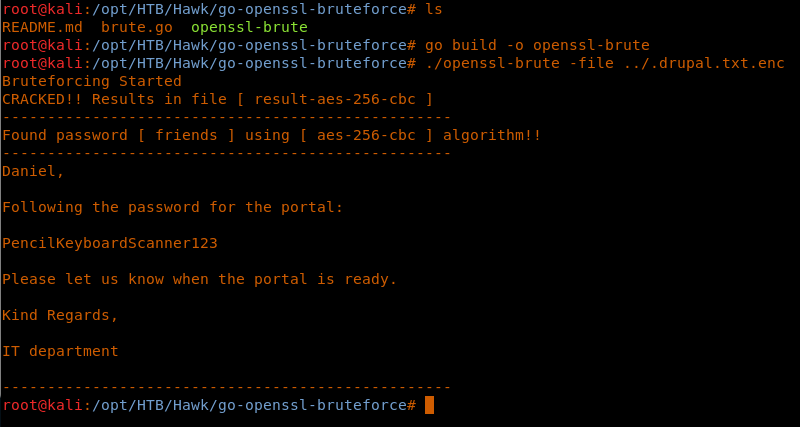 9. The above file type can be easily brute-forced using a utility mentioned here. As shown below, the binary was built first and then run to perform the brute-force option. It reveals the password of the portal.