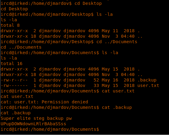 18. We got the directory for user “djmardov.” Under Documents, there is a user.txt, but it looks like permission is denied. Because we are currently under the ircd user, we need to escalate to djmardov.
