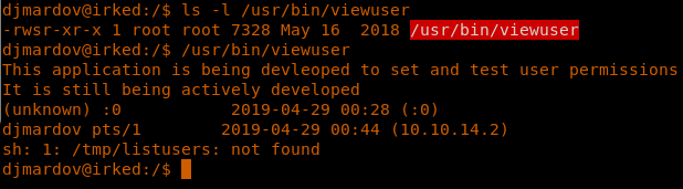 24. As is mentioned in previous articles, one of the ways to do this is to check for the SUID bit set. In this case, we have binary “viewuser” in /usr/bin.