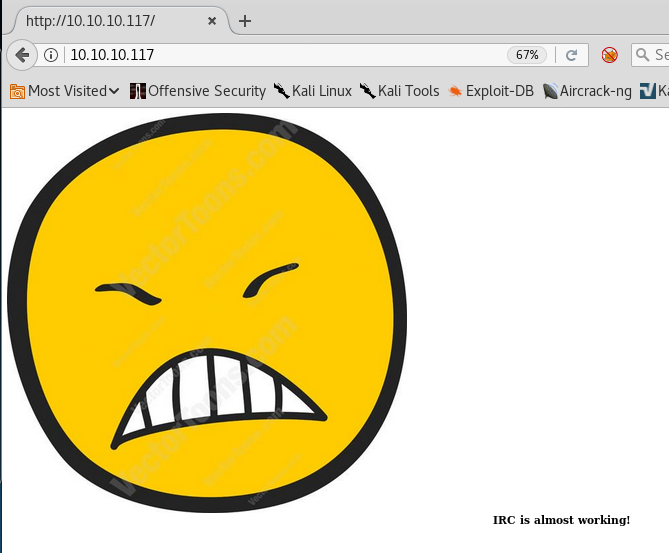 6. Let’s start the enumeration on port 80. Below is the landing page. One hint the page gives is that IRC is working on this box, but the initial Nmap scan does not reflect that. That indicates that we need to perform a full port scan as well.