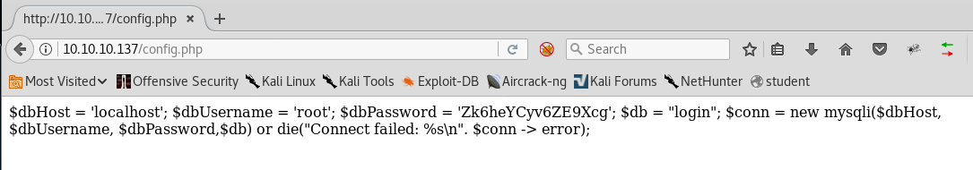 16. Enumerating config.php, it looks like we got a username and password. We tried that in the /management directory, but it did not work.