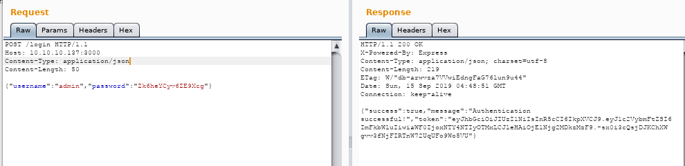 18. Let’s try to add the discovered credentials for our request to the login page on port 3000 by passing it as below. Below is the Burp request.
