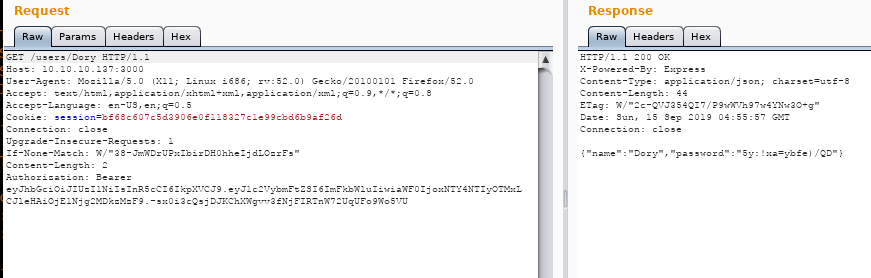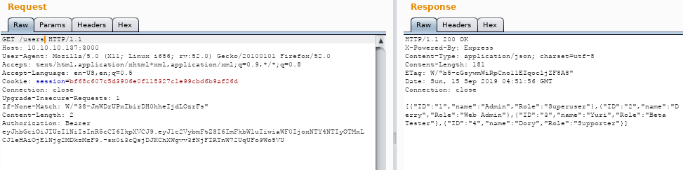 19. It looks like the auth was successful and in response, we got the token. Now let’s use this token and browse all the discovered directories under port 3000. Let’s start with /users.