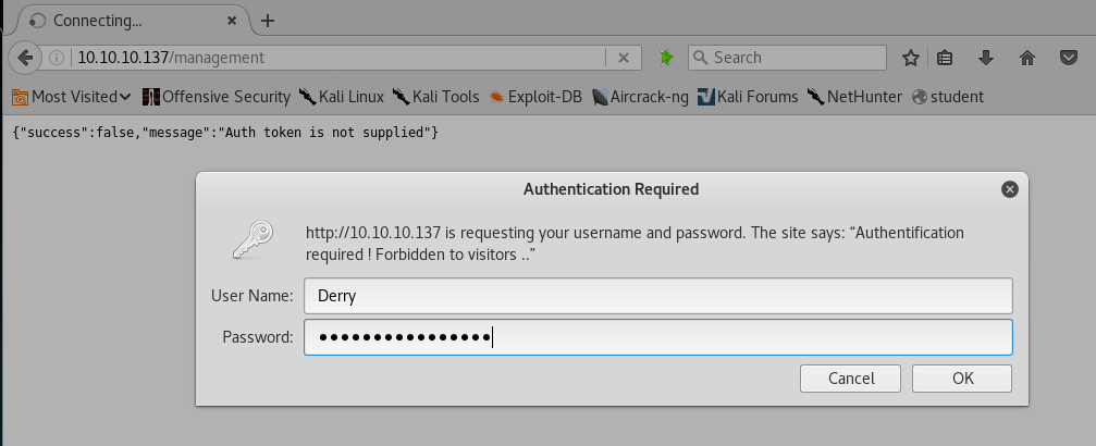 14. Hovering over the /management directory, it asks for username and password, which we do not have as of now.