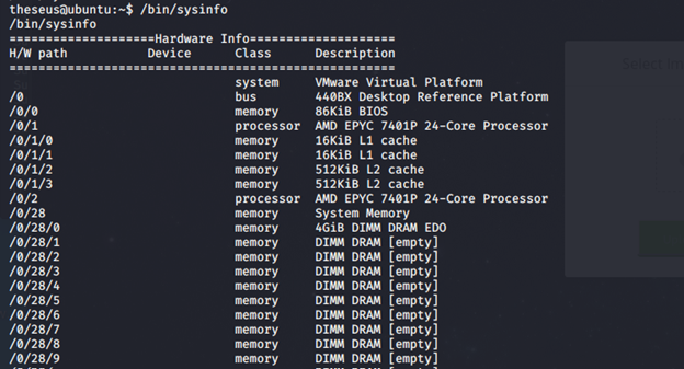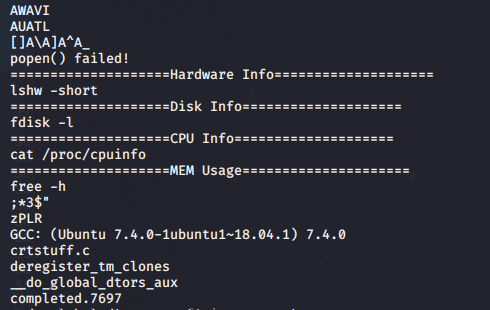 - Running strings on the binary reveals multiple commands in use such as fdisk, free and so on.