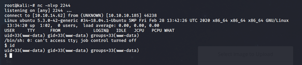 - Browsing that uploaded shell, we got a reverse shell back as www-data.