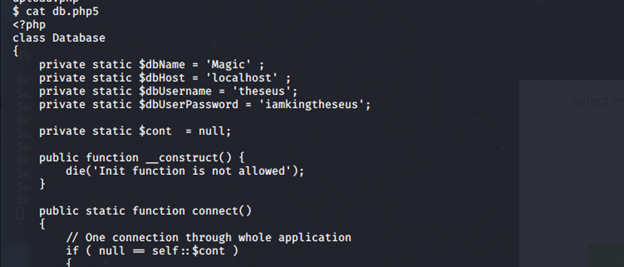 - Enumerating the system, we got a DB file named db.php5, which revealed a surname and password for user “theseus”. Trying to sudo that user with the password failed.