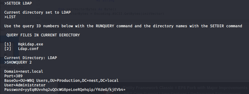 - Change directories using the SETDIR command and go to the LDAP directory. Under that, we’ve got LDAP.conf, which reveals the administrator hash.