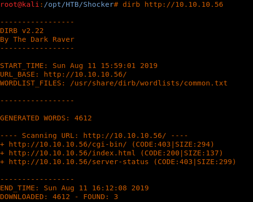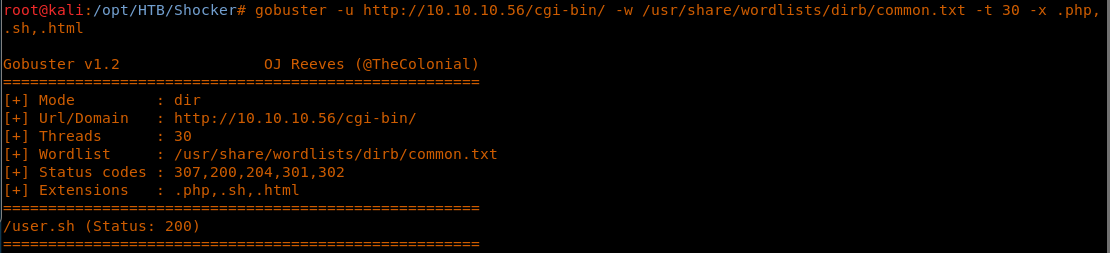 <<gobuster -u http://10.10.10.56/cgi-bin/ -w /usr/share/wordlists/dirb/common.txt -t 30 -x .php,.sh,.html>>