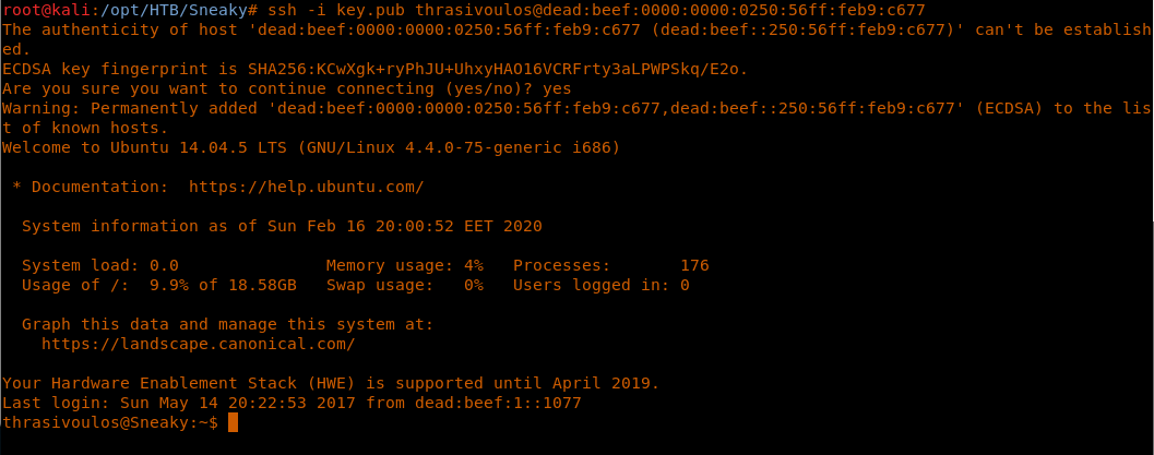 - As shown below, we can log in using the saved key and the discovered IPv6 interface.