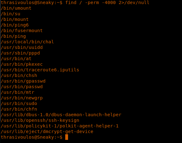 - Further enumerating for escalating privilege, we can see that the suid bit is set on following files.
