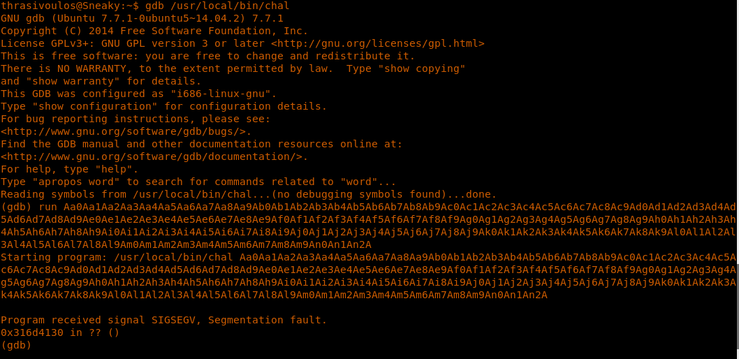 - Now we have the offset, we need to find the EIP location. Let’s do that with random As with GDB, as shown below.