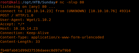 27. We can use the wget --post-file parameter to post the contents of root.txt. Let’s see if that works. We spin up a Netcat listener on port 80 on our attacker machine.