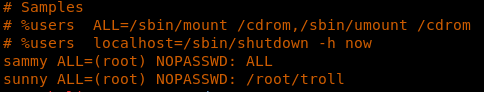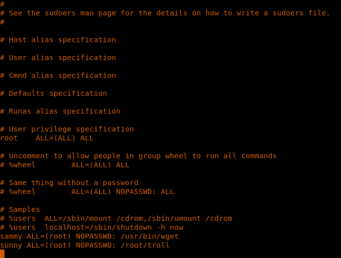 29. What if we post the /etc/sudoers file and make Sammy or Sunny execute anything as root? Let’s first see the contents of /etc/sudoers.