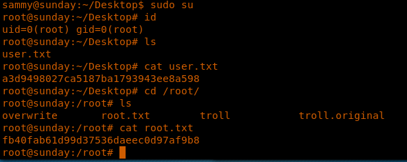 32. Now we can see that with just one command, Sammy becomes root and take complete control of the box.